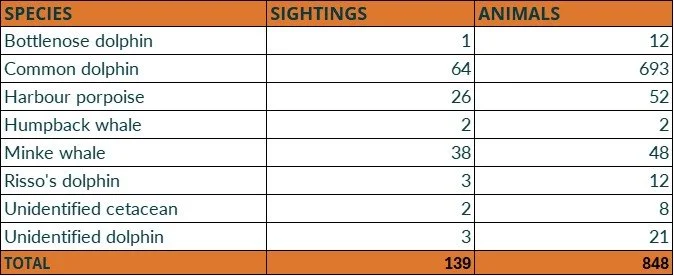 Total number of sightings and individual cetaceans logged over the six crossings.