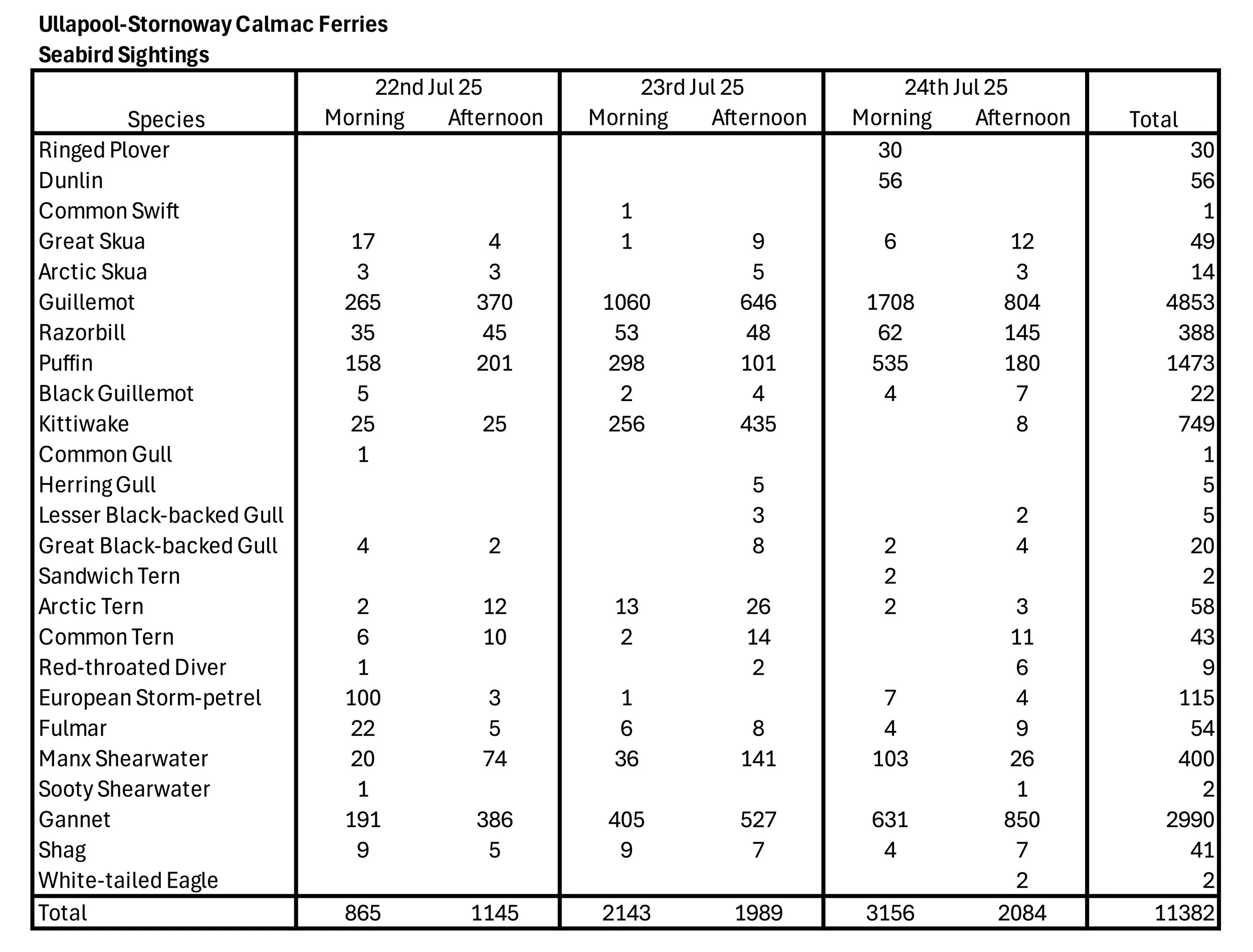We recorded all the bird species expected at this time of year and it was heartening to see very large numbers of Puffins (up to 535 recorded on one crossing) as well as a maximum of 12 Great Skuas, a species massively impacted by Avian Influenza in Scotland. Our first voyage also produced an impressive 100 European Storm-petrels and we recorded Sooty Shearwater on two legs, a species that breeds in the South Atlantic. It was also nice to witness a few other migrants with flocks of Ringed Plover and Dunlin heading south and even a lone Common Swift making its way across the Minch. All in all we logged over 11,000 birds which isn’t bad going!